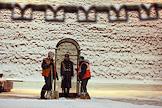 Солдат роты почетного караула на посту у Вечного огня на Могиле Неизвестного солдата в Александровском саду. Рабочие с лопатами чистят снег.