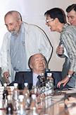Председатель Фонда защиты гласности Алексей Симонов (слева), социал-демократ Александр Яковлев (в центре) и заместитель руководителя фракции Союз Правых Сил, заместитель Председателя Государственной Думы России Ирина Хакамада (справа) на Первом заседании Российского Демократического совещания в здании Мэрии.