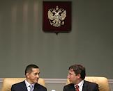 Исполнительный директор программы ООН по окружающей среде Ахим Штайнер (слева) и заместитель руководителя Федеральной службы по надзору в сфере природопользования Олег Митволь (справа) после пресс-конференции, посвященной встрече с министром природных ресурсов России (МПР) Юрием Трутневым. Встреча и пресс-конференция прошли в здании МПР России.