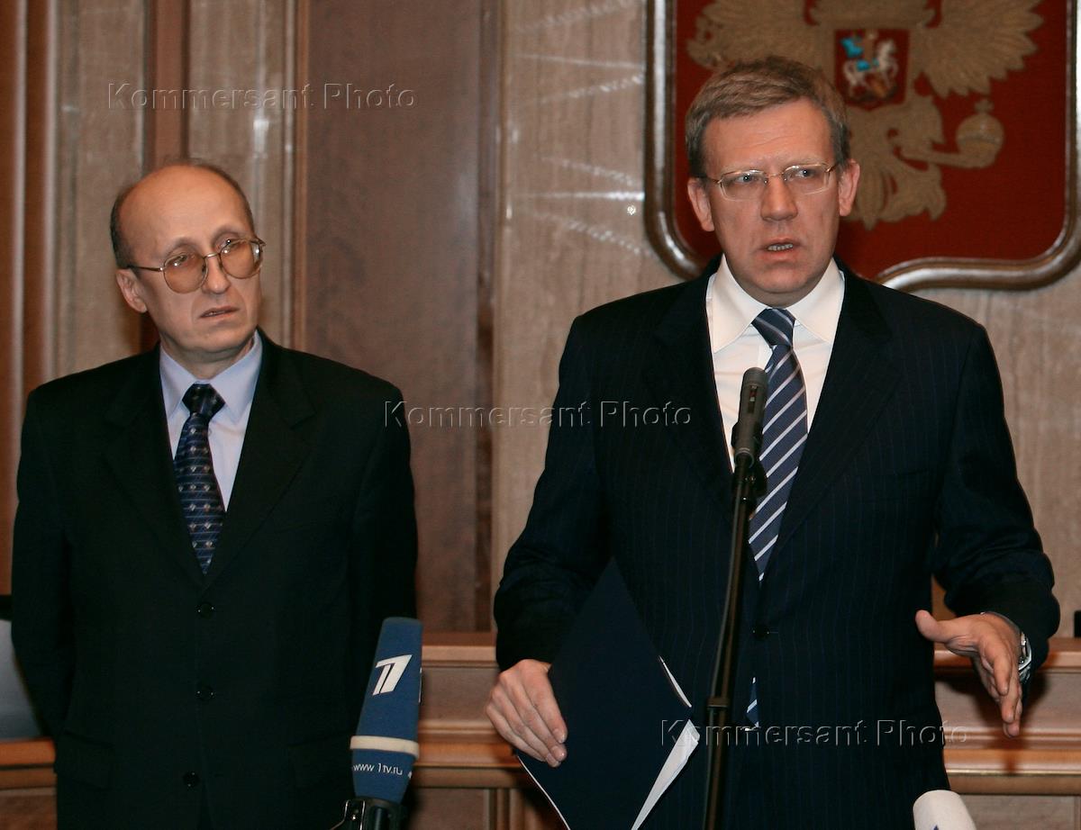 Министр финансов России Алексей Кудрин (справа) во время церемонии представления нового руководителя Федеральной службы по налогам и сборам России Михаила Мокрецова (слева).