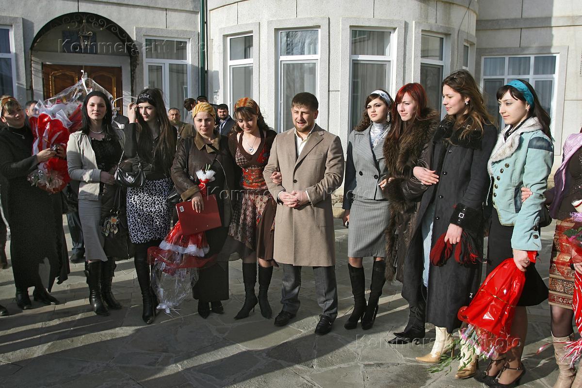 Исполняющий обязанности президента Чеченской Республики Рамзан Кадыров (в центре) во время встречи с участницами конкурса "Миссис Мира — 2007".