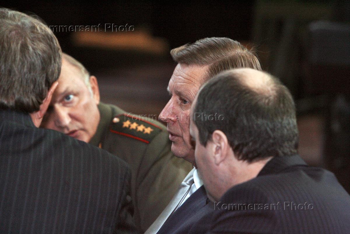 Заместитель министра обороны России по вооружению ВС, генерал армии Алексей Московский (второй слева) и первый заместитель председателя Правительства России Сергей Иванов (второй справа) во время выездного заседания Военно-промышленной комиссии России. Заседание прошло на НПП "Алмаз".