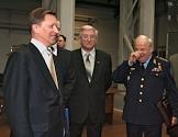 Главнокомандующий Военно-воздушными силами (ВВС) России, генерал армии Владимир Михайлов (слева) и министр обороны России Анатолий Сердюков (в центре) перед началом выездного заседания Военно-промышленной комиссии России. Заседание прошло на НПП "Алмаз".