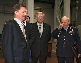 Первый заместитель председателя Правительства России Сергей Иванов (слева), генеральный директор ОАО НПП "Алмаз" Игорь Ашурбейли (в центре) и главнокомандующий Военно-воздушными силами (ВВС) России, генерал армии Владимир Михайлов (справа) во время выездного заседания Военно-промышленной комиссии России. Заседание прошло на НПП "Алмаз".