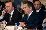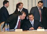 Руководитель Федерального агентства по лесному хозяйству (ФАЛХ) (Рослесхоз) МПР России Валерий Рощупкин (за столом слева) и министр природных ресурсов (МПР) России Юрий Трутнев (за столом справа) на Первом заседании лесной коллегии, посвященном проблемам реализации положений новой редакции лесного кодекса России. Заседание прошло в "Президент-отеле".