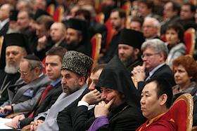 Митрополит Русской Православной старообрядческой Церкви Корнилий (слева), главный раввин России Адольф Шаевич (в центре) и верховный муфтий России и европейских стран СНГ Талгат Таджуддин (справа) на церемонии открытия XI Всемирного Русского Народного собора в Зале Церковных Соборов Храма Христа Спасителя.