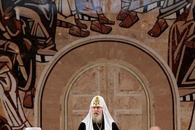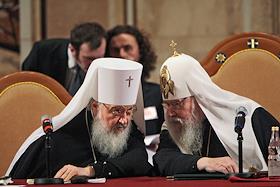 Патриарх Московский и всея Руси Алексий II (справа) и Председатель отдела внешних церковных связей Московского патриархата митрополит Смоленский и Калининградский Кирилл (слева) на церемонии открытия XI Всемирного Русского Народного собора в Зале Церковных Соборов Храма Христа Спасителя.