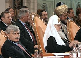 Полномочный представитель Президента России в Центральном федеральном округе Георгий Полтавченко (слева сидит), председатель Федерации независимых профсоюзов России (ФНПР) Михаил Шмаков (второй слева стоит), Патриарх Московский и всея Руси Алексий II (справа сидит), главный раввин России Адольф Шаевич (в центре стоит) и верховный муфтий России и европейских стран СНГ Талгат Таджуддин (второй справа стоит) на церемонии открытия XI Всемирного Русского Народного собора в Зале Церковных Соборов Храма Христа Спасителя.