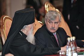 Полномочный представитель Президента России в Центральном федеральном округе Георгий Полтавченко (справа) на церемонии открытия XI Всемирного Русского Народного собора в Зале Церковных Соборов Храма Христа Спасителя.