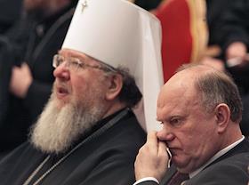 Лидер Коммунистической партии России (КПРФ), член Совета Государственной Думы Геннадий Зюганов (справа) на церемонии открытия XI Всемирного Русского Народного собора в Зале Церковных Соборов Храма Христа Спасителя.