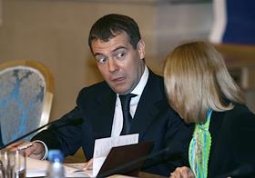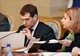 Первый заместитель председателя Правительства России Дмитрий Медведев (слева) и начальник объединенного управления пресс-службы и информации Президента России Наталья Тимакова на межотраслевой конференция "СМИ, книгоиздание, полиграфия: итоги 2006 года и перспективы развития". Конференция прошла в "Президент-отеле".