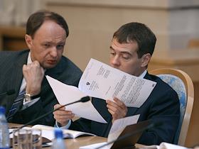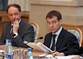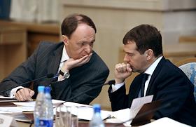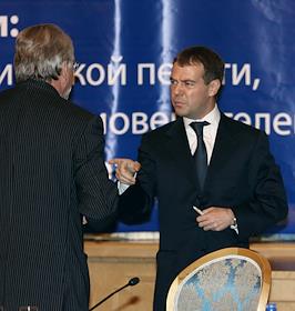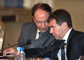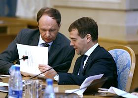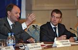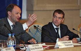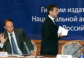 Руководитель Федерального агентства по печати и массовым коммуникациям (ФАПМК) России Михаил Сеславинский (слева) и первый заместитель председателя Правительства России Дмитрий Медведев (справа) на межотраслевой конференция "СМИ, книгоиздание, полиграфия: итоги 2006 года и перспективы развития". Конференция прошла в "Президент-отеле".