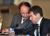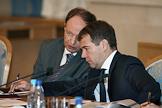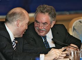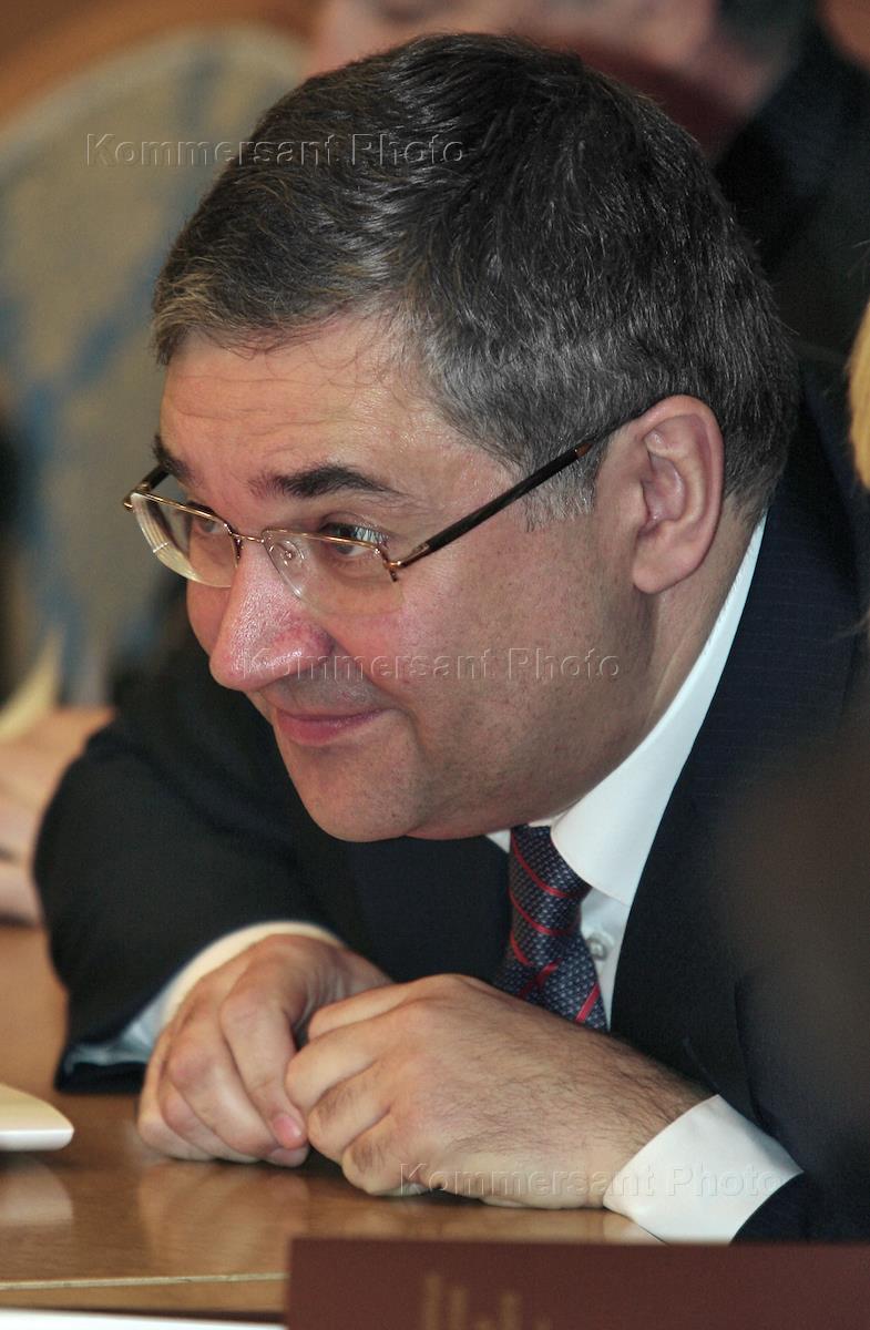 Советник руководителя Федерального агентства по печати и массовым коммуникациям Владимир Григорьев (слева) и председатель совета директоров холдинга "Проф-Медиа" Рафаэль Акопов (справа) на межотраслевой конференция "СМИ, книгоиздание, полиграфия: итоги 2006 года и перспективы развития". Конференция прошла в "Президент-отеле".