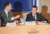 Руководитель Федерального агентства по печати и массовым коммуникациям Михаил Сеславинский (слева) и первый заместитель председателя Правительства России Дмитрий Медведев (справа) во время межотраслевой конференции на тему: "СМИ, книгоиздание, полиграфия: итоги 2006 года и перспективы развития". Конференция проходила в Президент отеле.