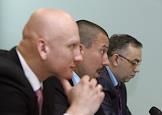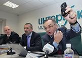 Адвокат Николай Разоренов (слева), председатель совета директоров ООО "Рус.Джи Пи Эс" Павел Панов (в центре) и генеральный директор ООО "Римко XXI" Сергей Мосиенко (справа) на пресс-конференции, посвященной первым итогам судебного разбирательства по иску, поданному компанией "RussGPS" против компании "Motorola", и встречному иску "Motorola" против "RussGPS". Пресс-конференция прошла в центральном офисе агентства "Интерфакс".