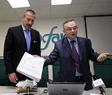 Председатель совета директоров ООО "Рус.Джи Пи Эс" Павел Панов (слева) и генеральный директор ООО "Римко XXI" Сергей Мосиенко (справа) на пресс-конференции, посвященной первым итогам судебного разбирательства по иску, поданному компанией "RussGPS" против компании "Motorola", и встречному иску "Motorola" против "RussGPS". Пресс-конференция прошла в центральном офисе агентства "Интерфакс".