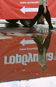 Отражение в луже указателя нового рынка аудио и видео продукции "Горбушка" в спорткомплексе ЦСКА.