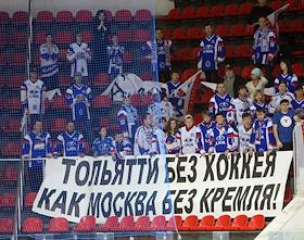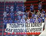 Хоккейный матч между командами "ЦСКА" - "Лада" прошел в Ледовом Дворце "ЦСКА". Болельщики команды "Лада" с транспарантом "Тольятти без хоккея - как Москва без Кремля".