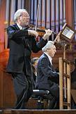 Скрипач Гидон Кремер (слева) и австрийский пианист Олег Майзенберг (справа) во время выступления на концерте в Большом зале Московской консерватории.