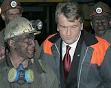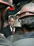 Президент Украины Виктор Ющенко (в центре) во время встречи с шахтерами на Шахтоуправлении "Луганское".
