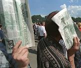Зрители закрылись от солнца газетами "Соотечественники" во время проведения традиционного общегородского татаро-башкирского праздника "Сабантуй" в Измайловском парке.
