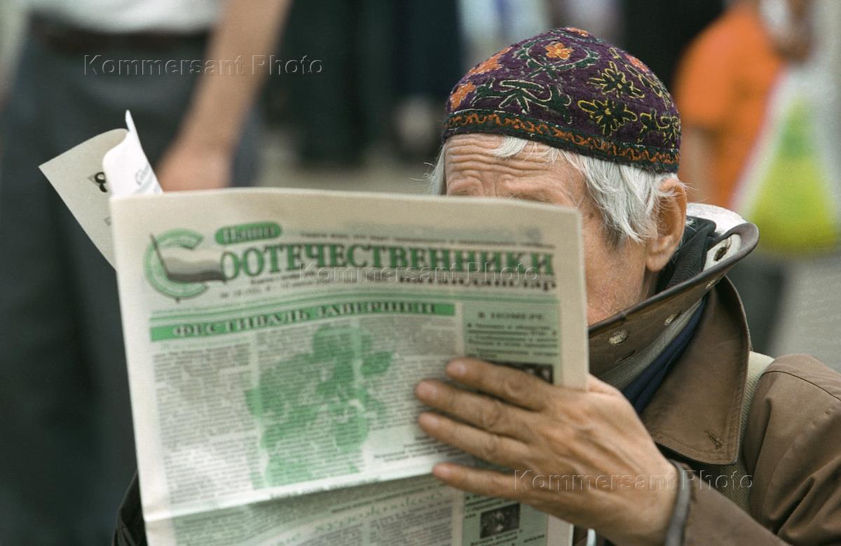 Один из участников читает газету "Соотечественники" во время проведения традиционного общегородского татаро-башкирского праздника "Сабантуй" в Измайловском парке.