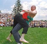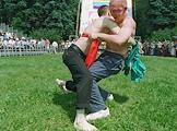 Соревнование борцов на традиционном общегородском татаро-башкирском празднике "Сабантуй" в Измайловском парке.