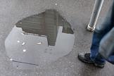 Пожар в бизнес-центре "Дукат-палас" на улице Гашека. Загорелся внутренний утеплитель между обшивкой фасада и капитальной стеной с 8 по 15 этажи, площадь пожара составила 300 кв м. Пострадавших нет. В луже отражается здание бизнес-центра "Дукат-палас".