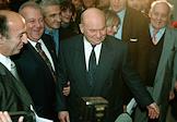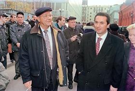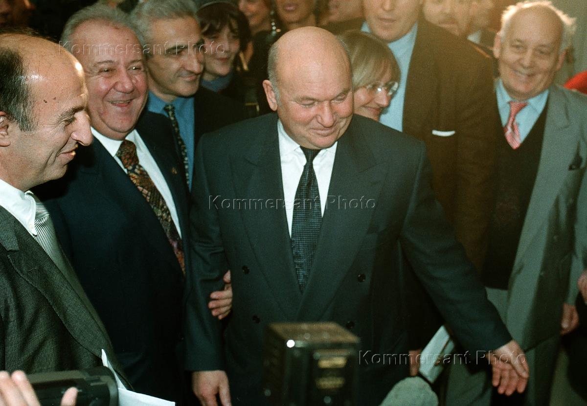 Sculptor Zurab Tsariteli holding hand of Moscow Mayor Yury Luzhkov during inauguration of his exhibition.