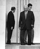 Начальник Службы охраны Президента Александр Коржаков наблюдает из-за кулис зала Большого Кремлевского Дворца за тем, как Президент России Борис Ельцин спускается по ступеням, направляясь на встречу с Президентом США Биллом Клинтоном во время официального визита последнего в Москву.
