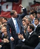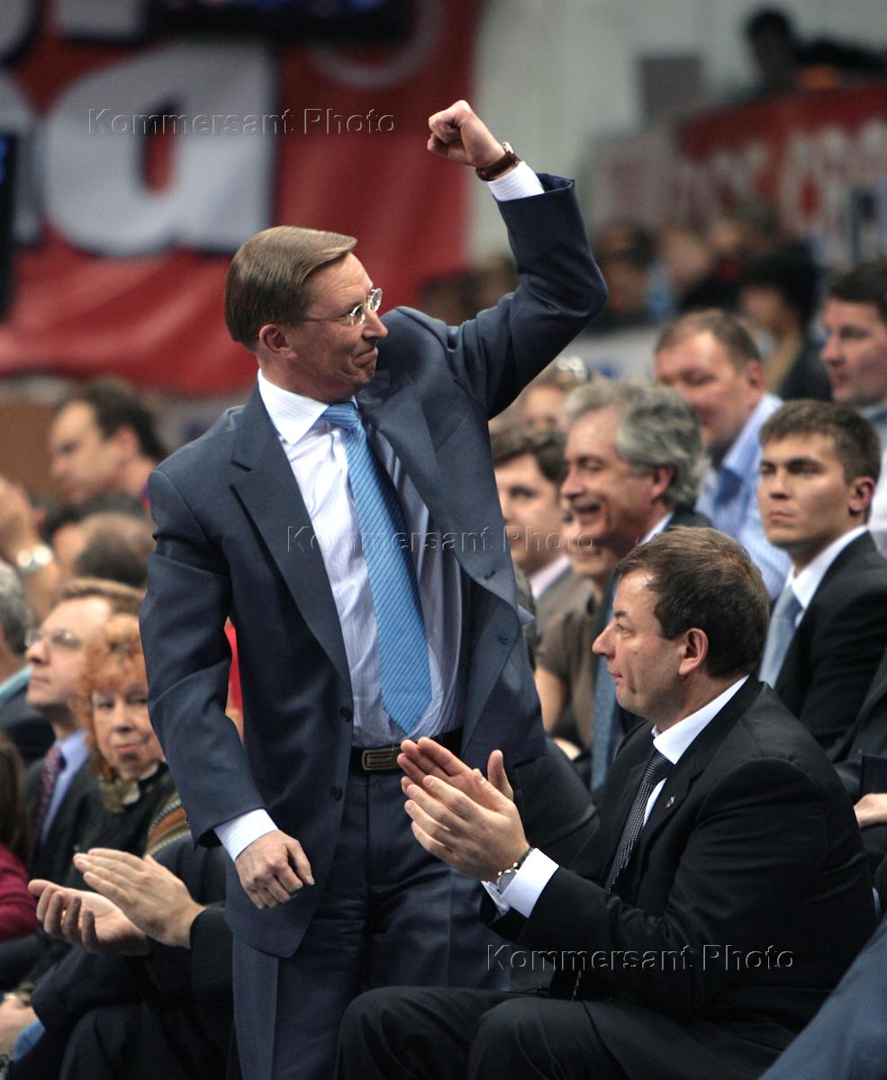 Баскетбол. Евролига. Первый заместитель председателя Правительства России Сергей Иванов (в центре) и начальник ФГУ "Центральный спортивный клуб Армии" (ЦСКА) Сергей Кущенко (справа) во время матча между командами "ЦСКА" (Россия) - "Маккаби" (Тель-Авив, Израиль). Матч прошел в Универсальном спортивном комплексе "ЦСКА".