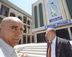 Депутат Государственной Думы России от фракции КПРФ Василий Шандыбин (слева) и лидер ЛДПР, заместитель председателя Государственной Думы России Владимир Жириновский (справа) у здания Иракского национального Совета во время поездки группы российских депутатов в Ирак.