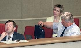 Председатель Федерации независимых профсоюзов России Михаил Шмаков (в центре) во время обсуждения проектов Трудового кодекса России (КЗоТ) на очередном заседании Государственной Думы.