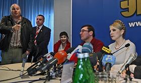 Народный депутат Украины, лидер фракции БЮТ Юлия Тимошенк (справа) и лидер гражданского движения "Народная самооборона" Юрий Луценко (второй справа) во время пресс-конференции лидеров оппозиции.