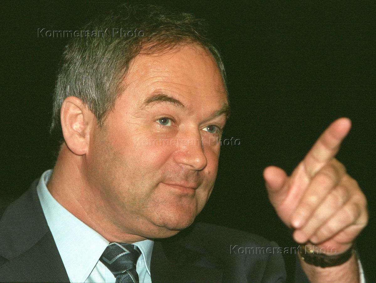 The Chairman of the State Fishing Committee Eugeny Nazdratenko (right) after a news conference on the Fisherman's Day. The meeting with journalists took place at the Fishery pavilion of the Russian Exhibition Center.