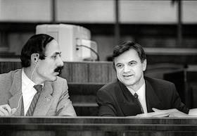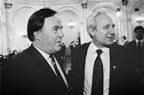 Заседание Верховного Совета России. Руководитель Федерального информационного центра России Михаил Полторанин (слева) и руководитель Администрации президента России Сергей Филатов (справа) перед началом заседания.