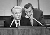 Президент России Борис Ельцин (слева) и заведующий Канцелярией президента России Валерий Семенченко (справа) во время заседания Верховного Совета России.
