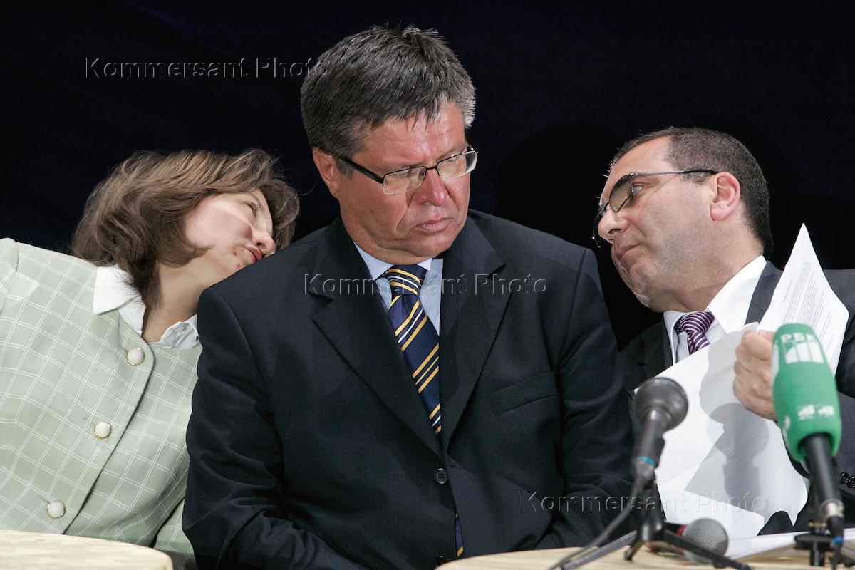 Заместитель начальника Управления учета и экономического анализа Федеральной службы страхового надзора (ФССН) Яна Мирошниченко (Слева), первый заместитель председателя Центрального Банка России Алексей Улюкаев (в центре) и президент Ассоциации Банков Центральной России Гарегин Тосунян (справа) во время брифинга на тему: "Российский финансовый рынок: итоги 2006 - перспективы 2007". Брифинг прошел в Галерее искусств Зураба Церетели.