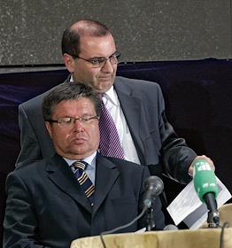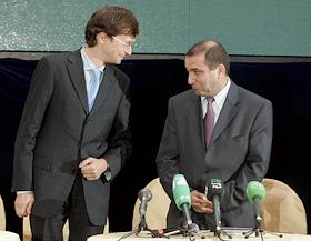 Директор Департамента финансовой политики Министерства финансов России Алексей Саватюгин (слева) и президент Ассоциации Банков Центральной России Гарегин Тосунян (справа) во время брифинга на тему: "Российский финансовый рынок: итоги 2006 - перспективы 2007". Брифинг прошел в Галерее искусств Зураба Церетели.