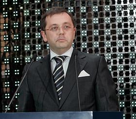 Заместитель председателя Комитета Государственной Думы России по кредитным организациям и финансовым рынкам, председатель банковского комитета Павел Медведев во время брифинга по теме "Российский финансовый рынок: итоги 2006 - перспективы 2007". Брифинг прошел в Галерее искусств Зураба Церетели.