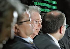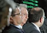 Руководитель Федеральной службы по финансовым рынкам России Олег Вьюгин (слева), президент Ассоциации Банков Центральной России Гарегин Тосунян (в центре) и первый заместитель председателя Центрального Банка России Алексей Улюкаев (справа) во время брифинга на тему: "Российский финансовый рынок: итоги 2006 - перспективы 2007". Брифинг прошел в Галерее искусств Зураба Церетели.