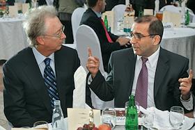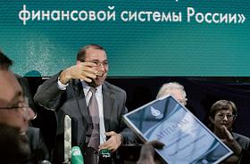 Руководитель Федеральной службы по финансовым рынкам России Олег Вьюгин (слева) и президент Ассоциации Банков Центральной России Гарегин Тосунян (справа) во время брифинга на тему: "Российский финансовый рынок: итоги 2006 - перспективы 2007". Брифинг прошел в Галерее искусств Зураба Церетели.