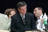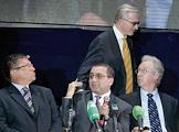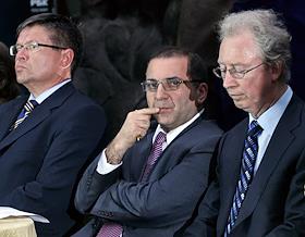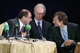 Президент Ассоциации Банков Центральной России Гарегин Тосунян (слева), руководитель Федеральной службы по финансовым рынкам России Олег Вьюгин (в центре) и директор Департамента финансовой политики Министерства финансов России Алексей Саватюгин (справа) во время брифинга на тему: "Российский финансовый рынок: итоги 2006 - перспективы 2007". Брифинг прошел в Галерее искусств Зураба Церетели.