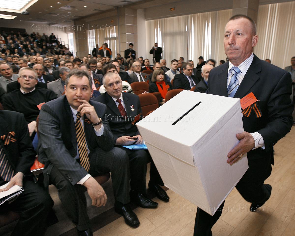 Член комитета Государственной Думы России по безопасности Дмитрий Рогозин (слева) во время учредительного съезда новой патриотической партии "Великая Россия". Съезд прошел в зале "Москва" гостиничного комплекса "Измайлово" (корпус "Гамма - Дельта").