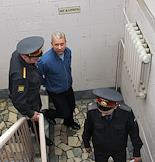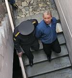 Бывший сотрудник МУРа Александр Евстигнеев (слева), проходящий по делу о коррупции в правоохранительных органах, после заседания Басманного суда.