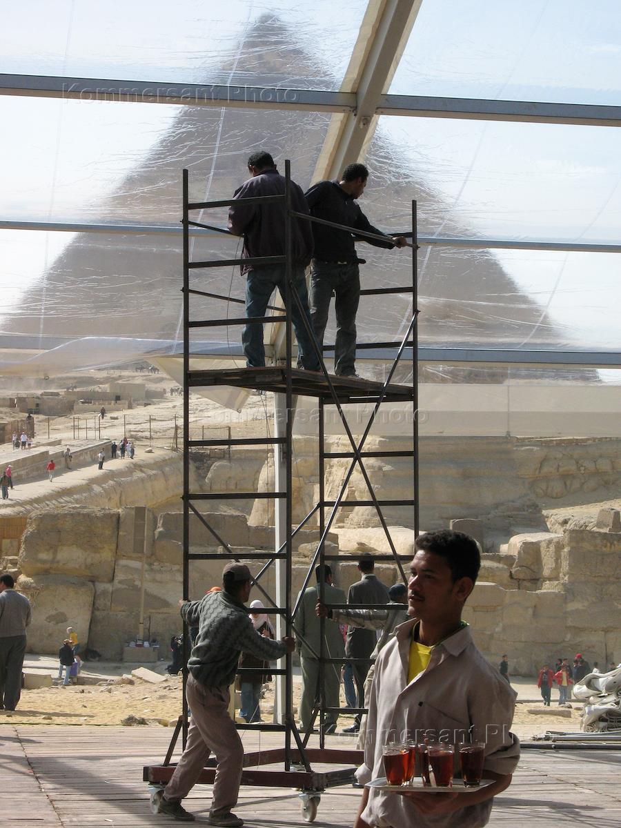 Строительство павильона для отдыха на фоне древних пирамид в Каире.