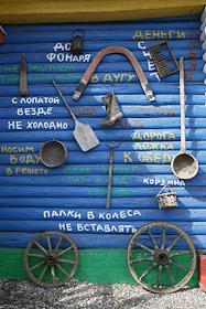 Город Переславль-Залесский. Музей чайников. Стена музея с шуточными пословицами и предметами русского быта.