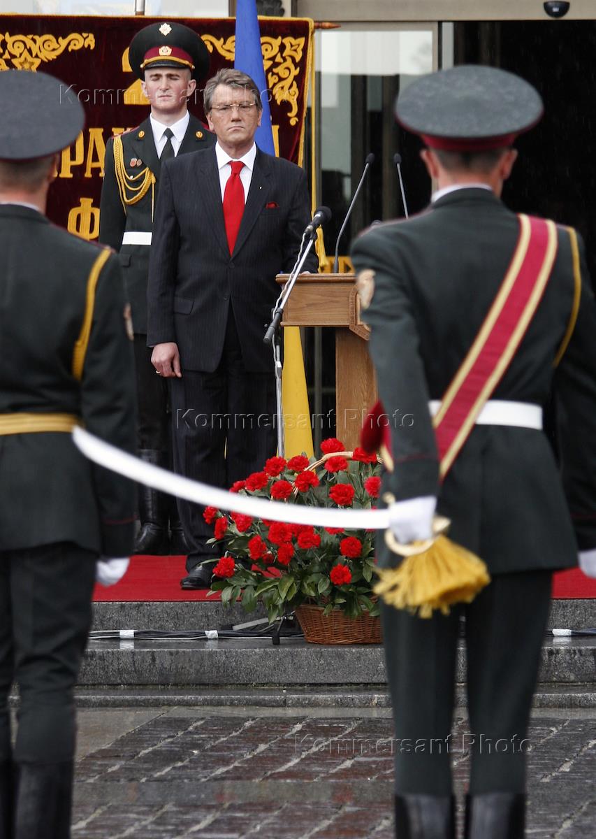 Президент Украины Виктор Ющенко (в центре) во время праздничного парада, посвященного Дню Победы.