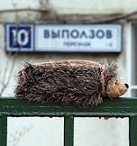 Игрушечный ежик на металлическом заборе на фоне таблички на жилом доме "Выползов переулок".