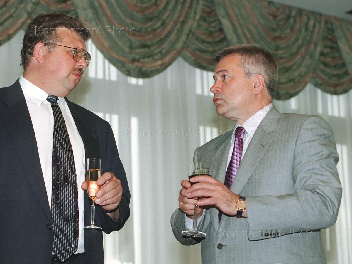 Генеральный директор ФГУП "РОСОБОРОНЭКСПОРТ" Андрей Бельянинов (слева) и президент нефтяной компании "ЛУКойл" Вагит Алекперов с бокалами на фуршете после подписания соглашения между ЛУКойлом и Оборонэкспортом.